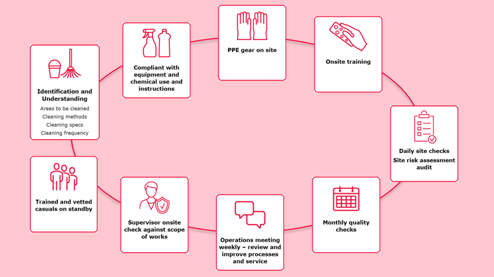 These are critical for every aspect of how we conduct ourselves at every touch point – from administration to the janitorial staff on the ground – these pillars of quality hold us all accountable and help us look after the people that we clean for, to keep them safe and well.