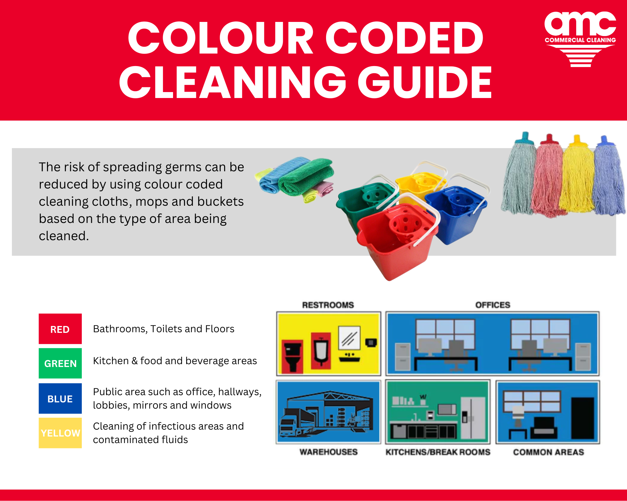 All AMC Commercial Cleaning janitorial staff, including porters, will observe the COLOUR CODE cleaning specification. This way, you will be protected from cross contamination from surface to surface.