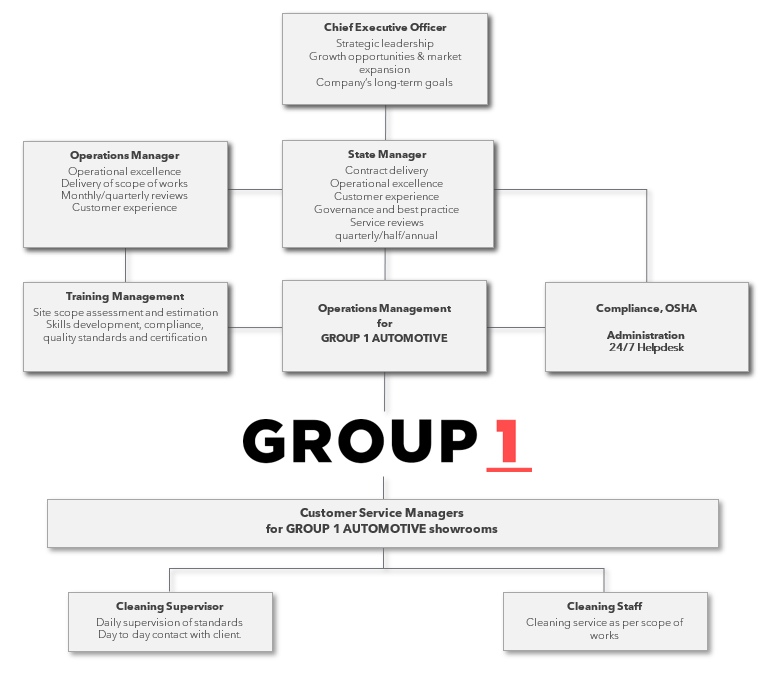 Our service delivery model for Group 1 Automotive will be structured to ensure clear communication is available between the cleaning crew and your facilities team at your dealerships.